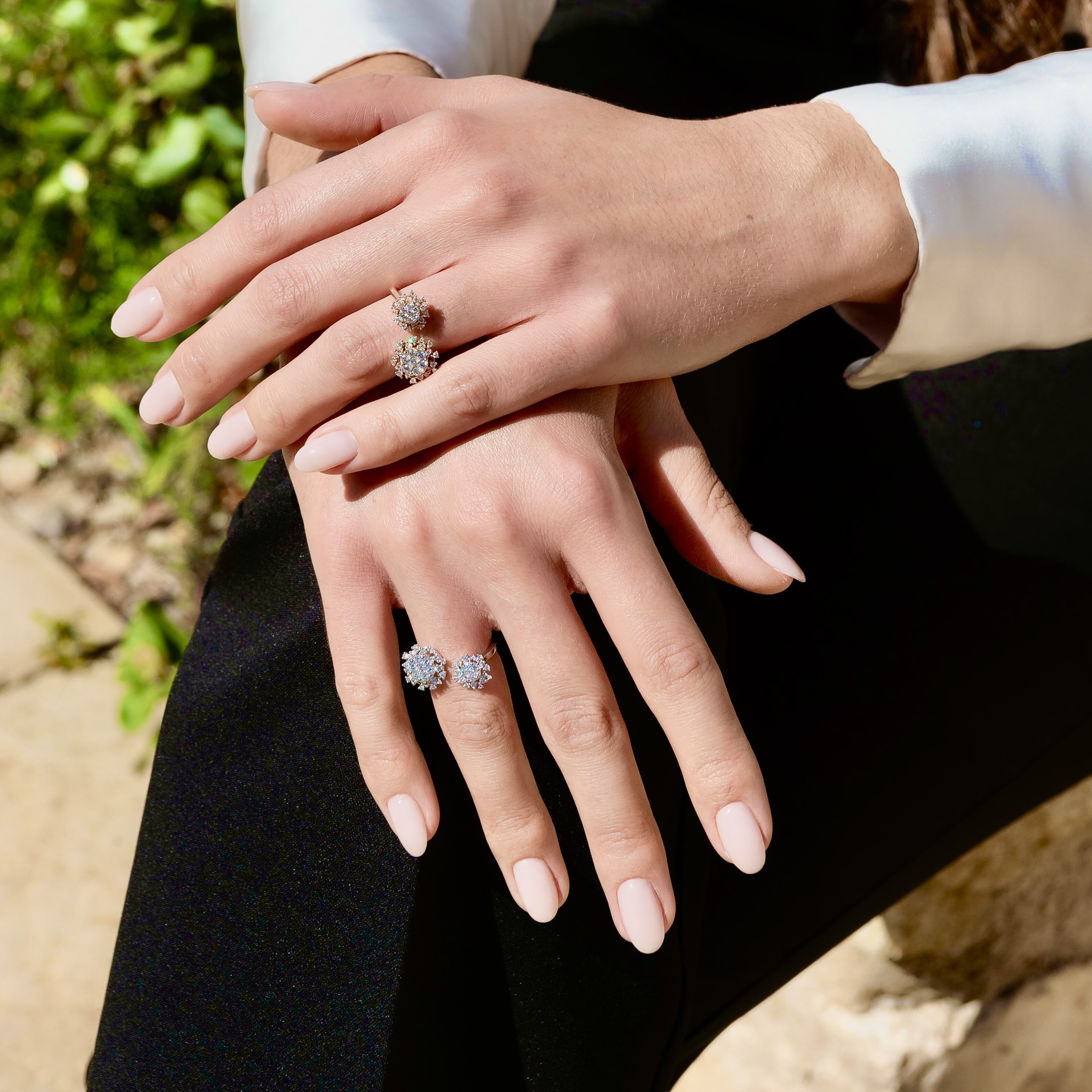 Each bloom is intricately set with brilliant-cut diamonds, arranged in a radiant cluster that captures the light with every movement. The refined asymmetry of the design evokes petals crystallized by a winter breeze, while the cool brilliance of the diamonds is beautifully enhanced by the icy sheen of the white gold. The inner band, engraved with Raynal, reflects the meticulous craftsmanship and artistic intention behind every detail.