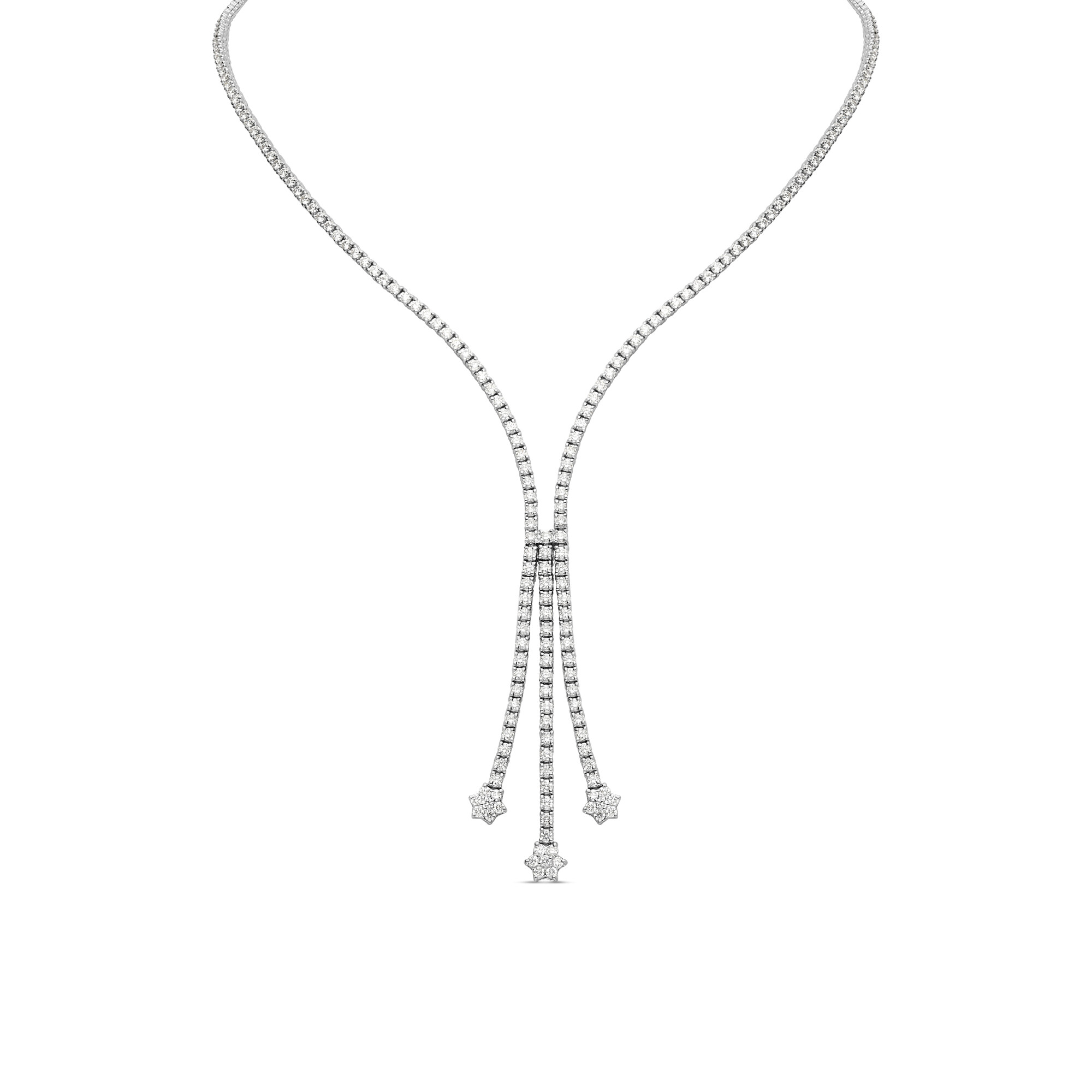 At its center, three supple strands cascade delicately, each adorned with a star-shaped motif pavé-set with diamonds — evoking constellations suspended at the décolleté. The articulated structure allows the necklace to move gracefully with the wearer, capturing light with every gesture in a choreography of dazzling refinement.
