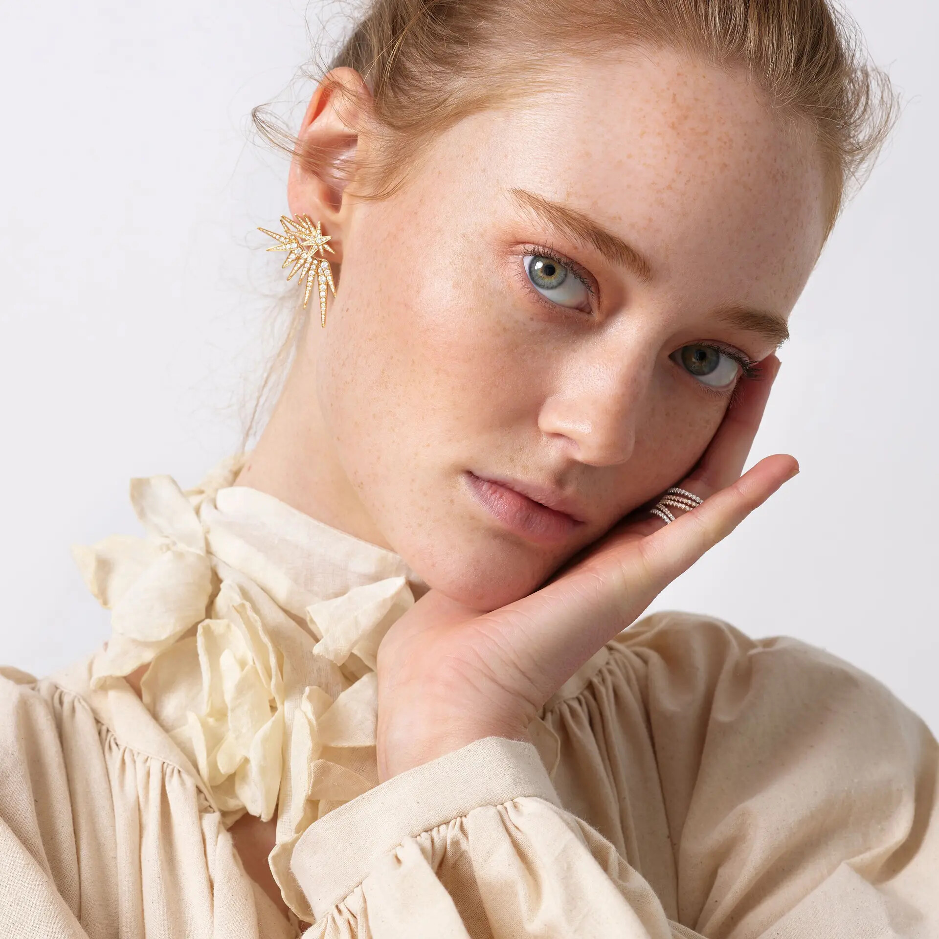 Designed by Charlotte Lynggaard, the 9-point Funky Stars earring pendant is a sculptural piece crafted in 18K yellow gold, set with 70 brilliant-cut diamonds totaling 0.99 carat TW.VS. Measuring 32 mm at its widest point, this striking creation is part of the Funky Stars Collection, celebrated for its avant-garde style and multidimensional brilliance. Crafted using innovative techniques, the layered diamond setting offers exceptional sparkle and depth.
