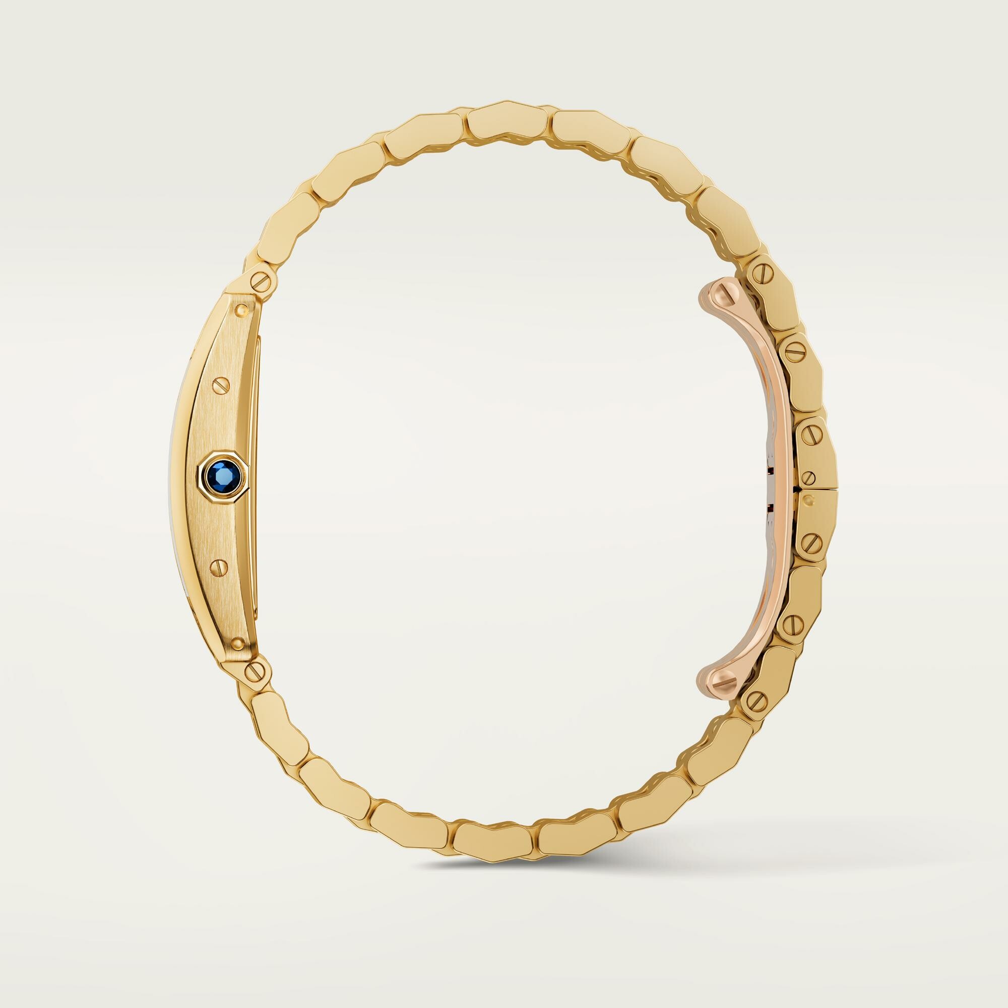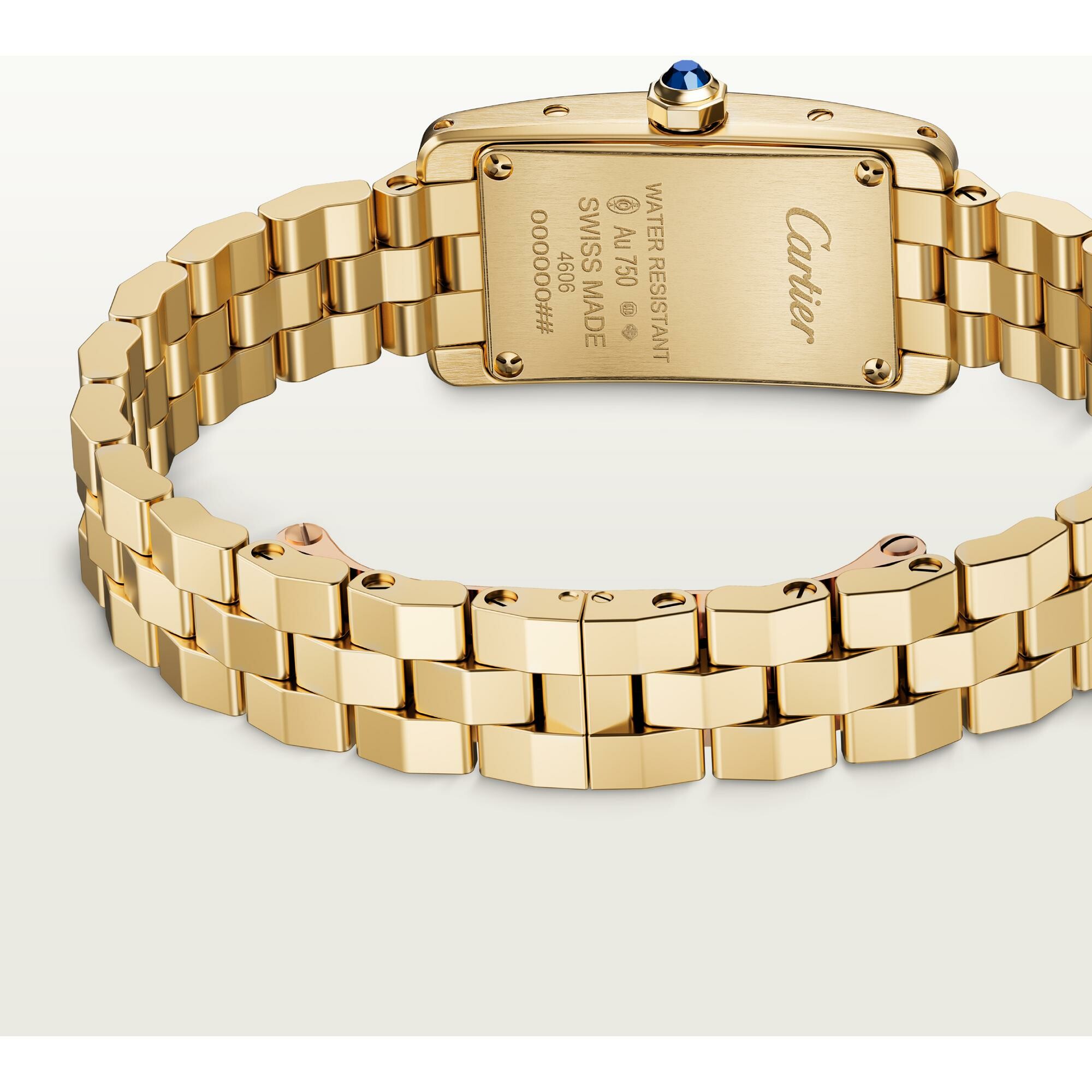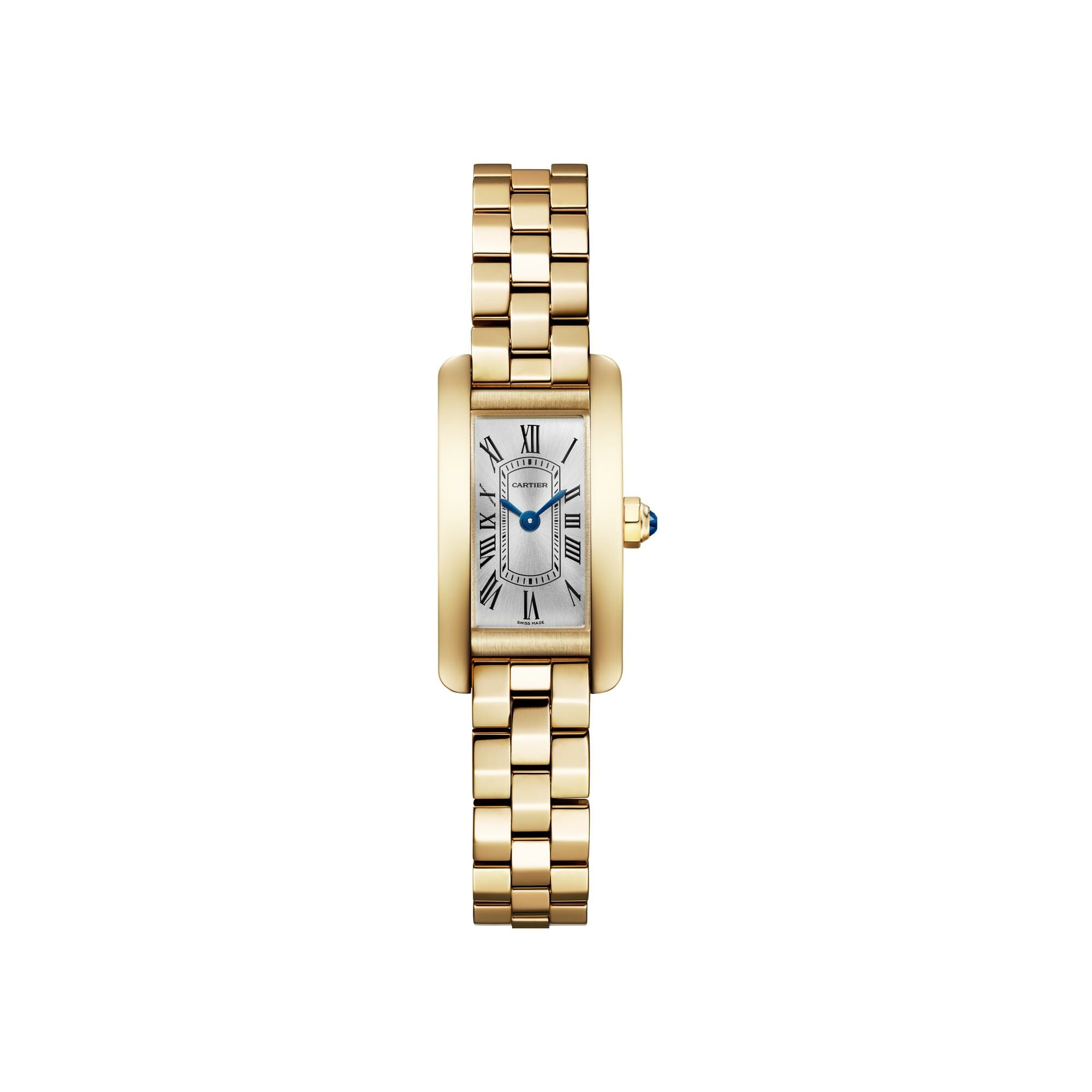 Tank Américaine watch, mini model, high autonomy quartz movement. 18K yellow gold (750/1000) case. Dimensions: 28 x 15.2 mm, thickness: 6.5 mm. Satin-finished silvered dial with sunray-effect. 18K yellow gold (750/1000) octagonal crown set with a faceted sapphire. Blued-steel sword-shaped hands. 18K yellow gold (750/1000) bracelet. Water-resistant up to 3 bar (approx. 30 meters/100 feet).