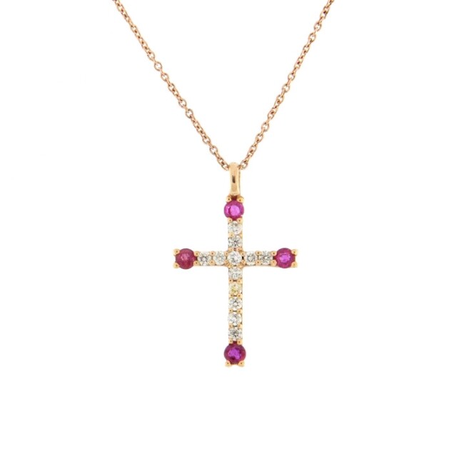 Pendentif Croix Eclat de Foi en or rose diamants rubis