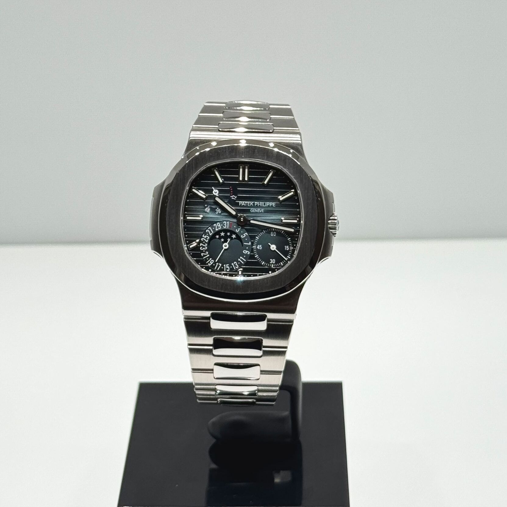 La Nautilus 5712 combine harmonieusement complication phases de Lune, indicateur de réserve de marche et date par aiguille, le tout porté par un boîtier fin et un bracelet intégré en acier. Une montre recherchée par les collectionneurs, offrant un équilibre parfait entre sophistication et confort au poignet.