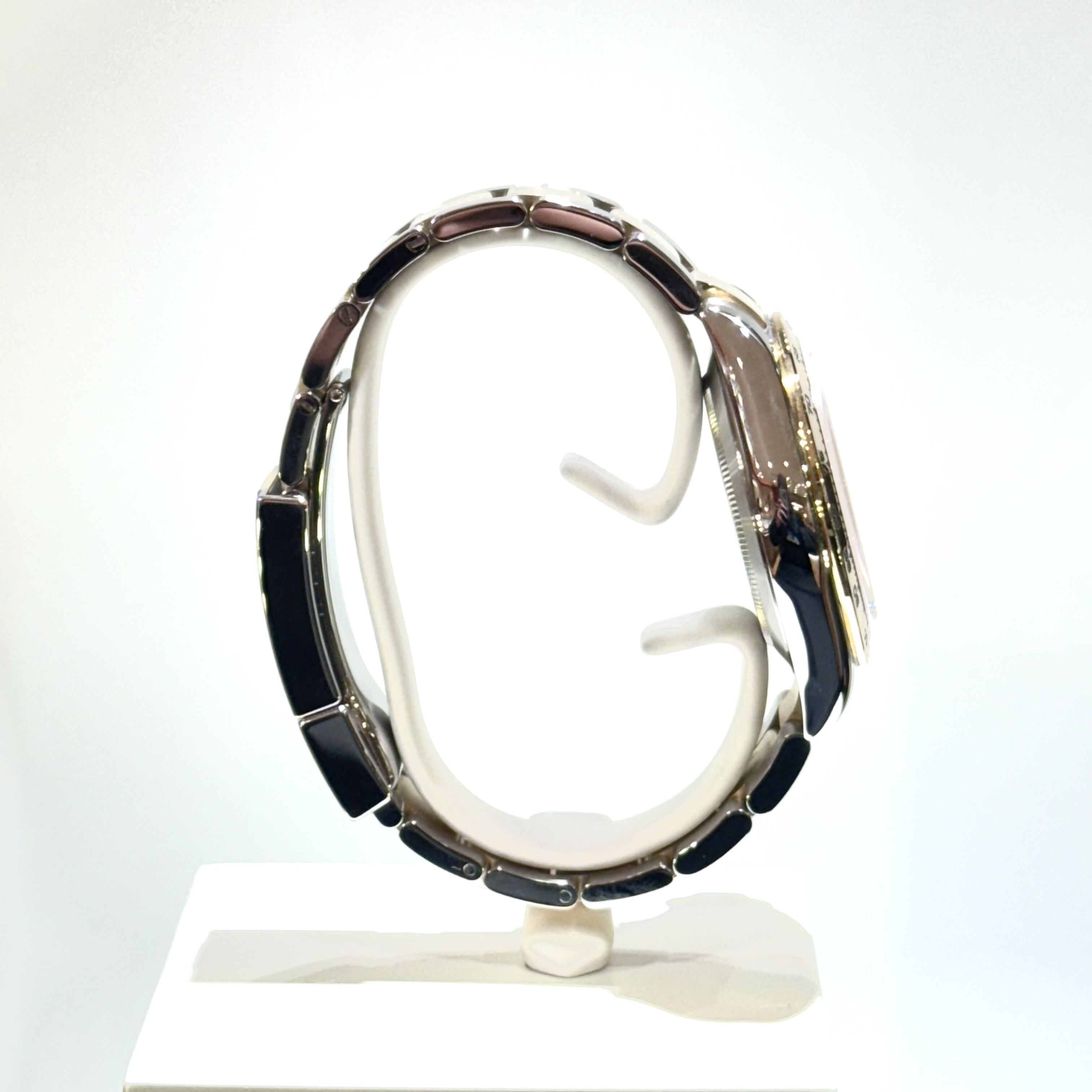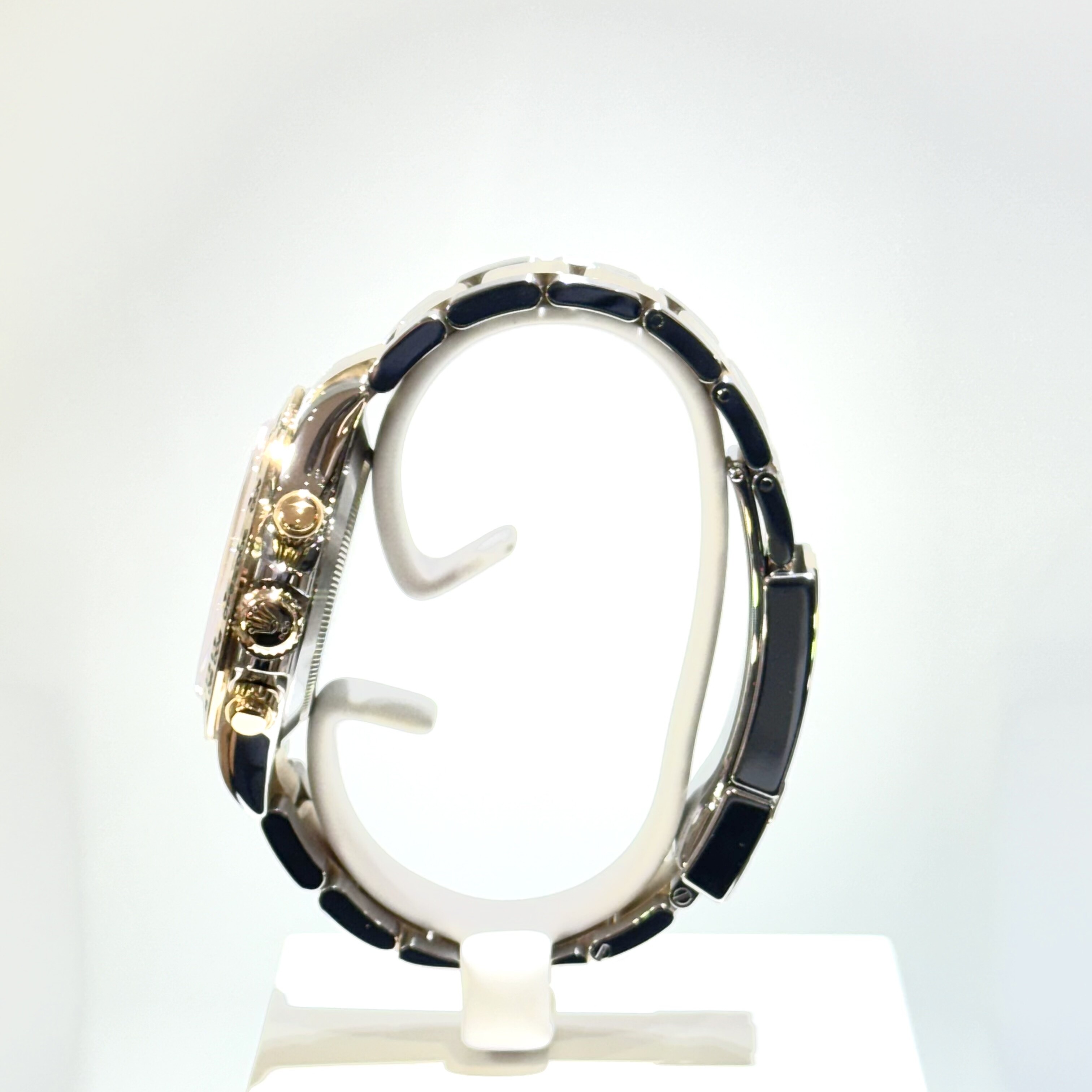 Son cadran champagne, sublimé par trois compteurs chronographes, assure une excellente lisibilité tout en renforçant son identité iconique. La lunette tachymétrique permet de mesurer des vitesses moyennes, faisant de cette Daytona un véritable instrument de précision.