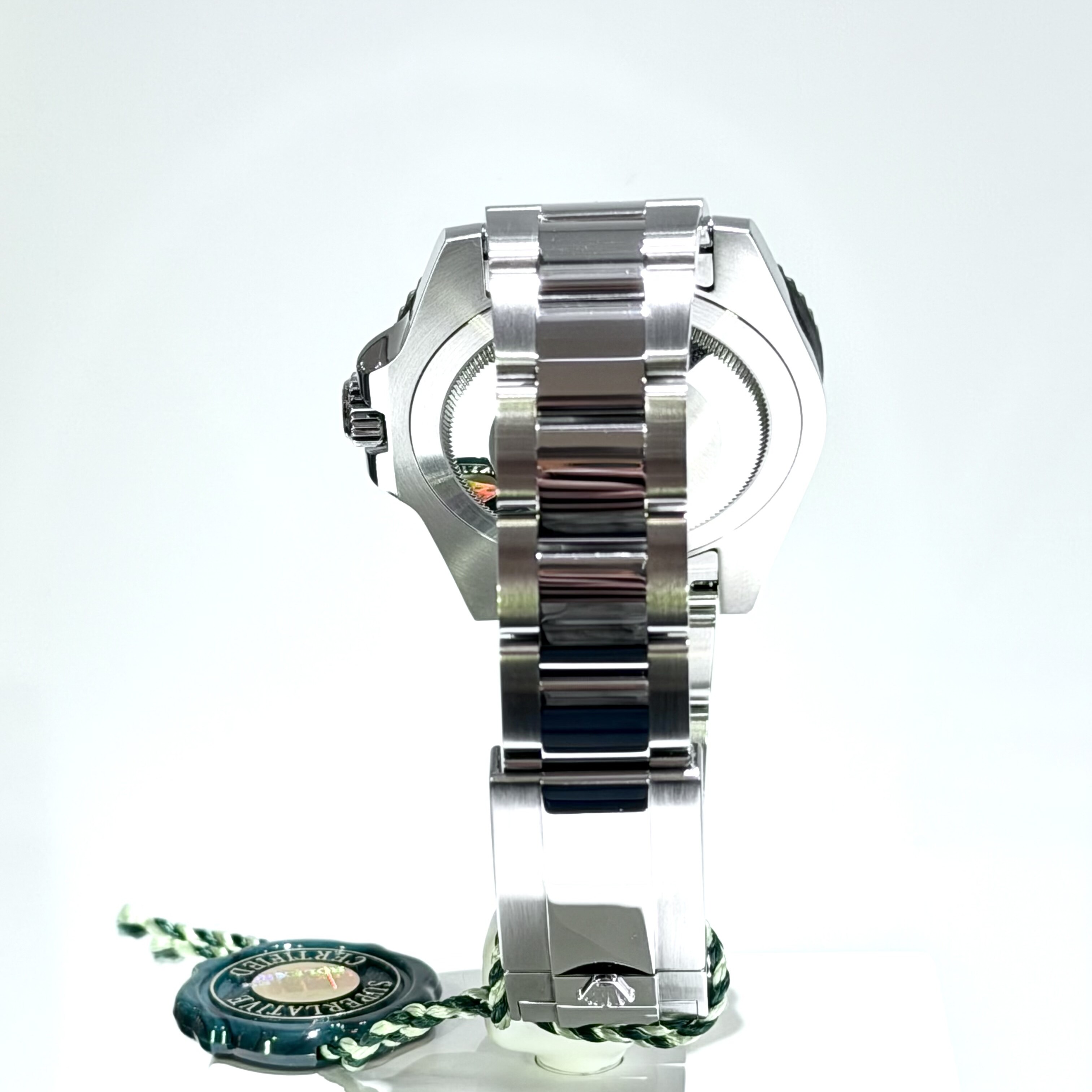 Son boîtier Oyster de 40 mm en acier Oystersteel garantit robustesse et résistance à la corrosion, tandis que le cadran noir offre une lisibilité optimale grâce aux index et aiguilles Chromalight. La fonction GMT permet l’affichage simultané de deux fuseaux horaires via l’aiguille 24 heures.