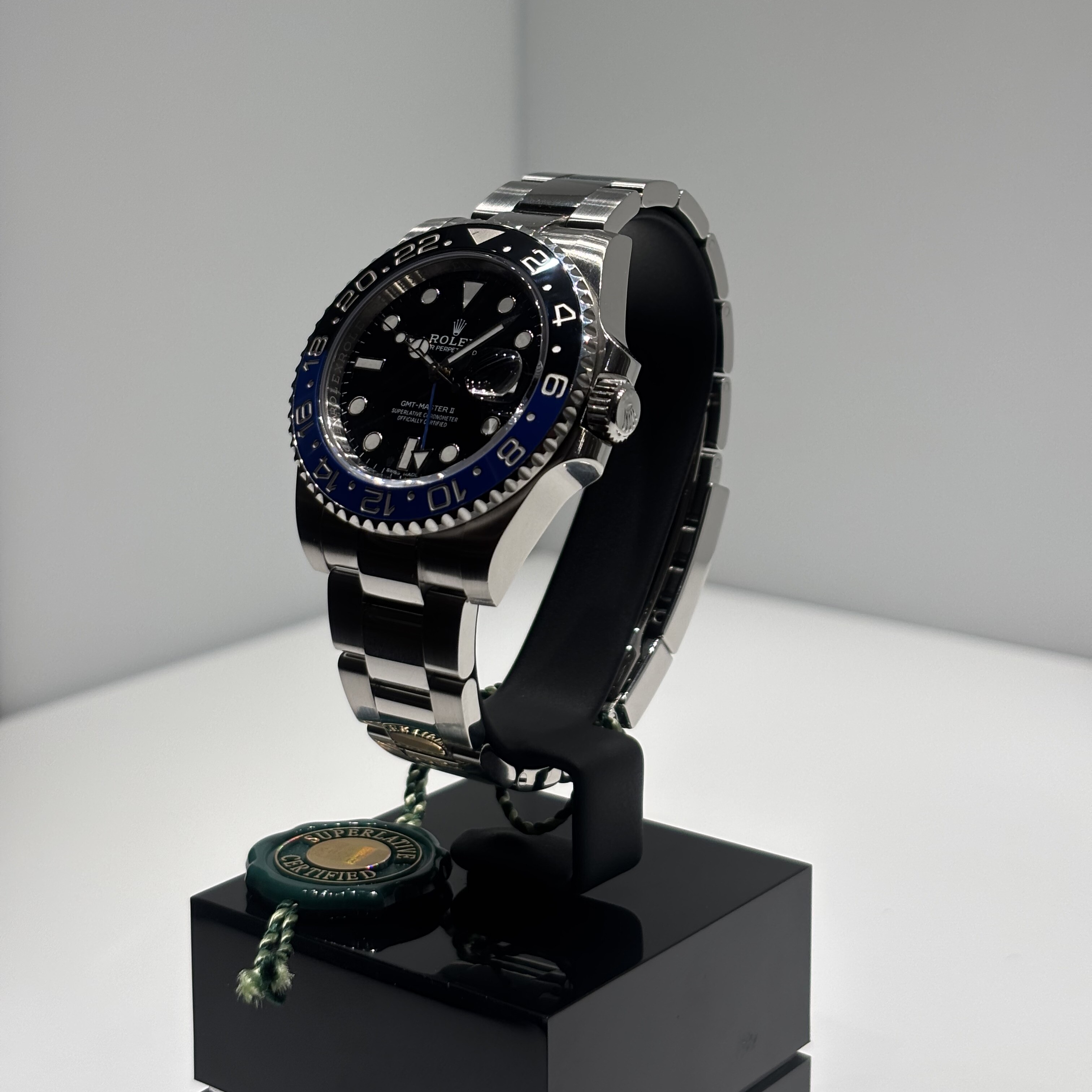 Superbe Rolex GMT-Master II “Batman”, dans sa configuration emblématique avec lunette céramique noire et bleue Cerachrom et bracelet Oyster.