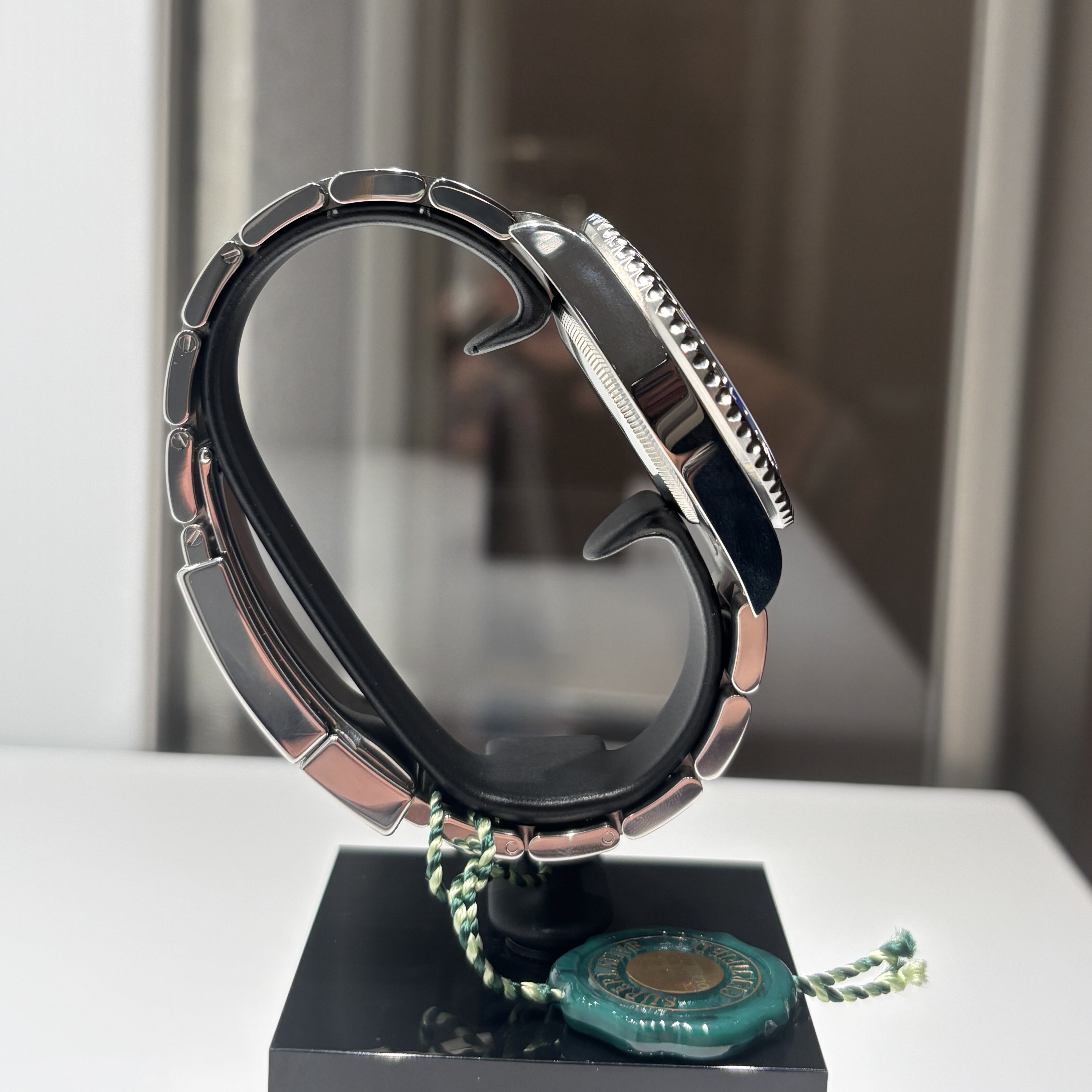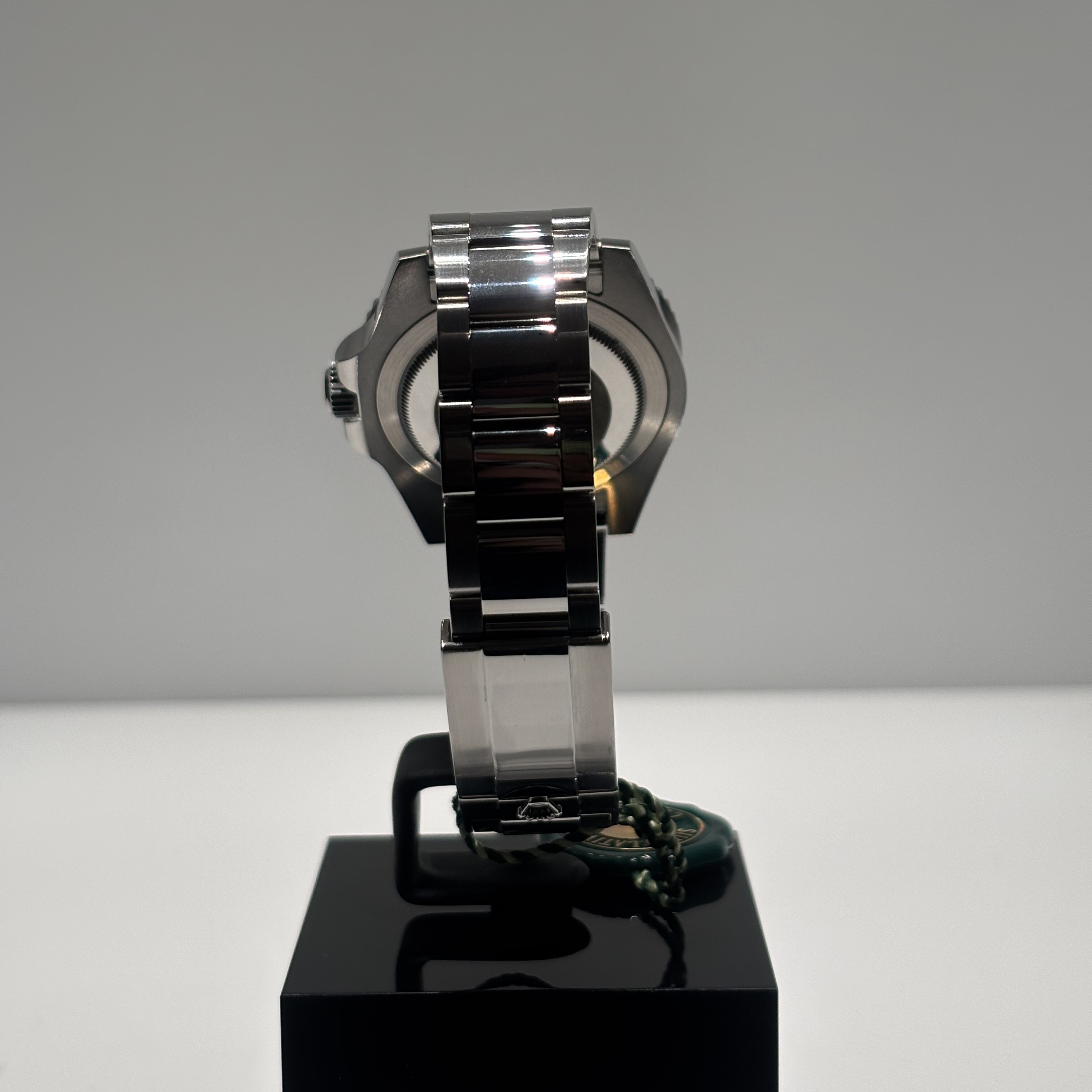 Son boîtier de 40 mm en acier Oystersteel, à la fois robuste et élégant, abrite un cadran noir laqué à la lisibilité remarquable, rehaussé d’index Chromalight à luminescence bleue. La lunette bidirectionnelle graduée sur 24 heures permet la lecture d’un second fuseau horaire via l’aiguille GMT bleue, signature distinctive de ce modèle.