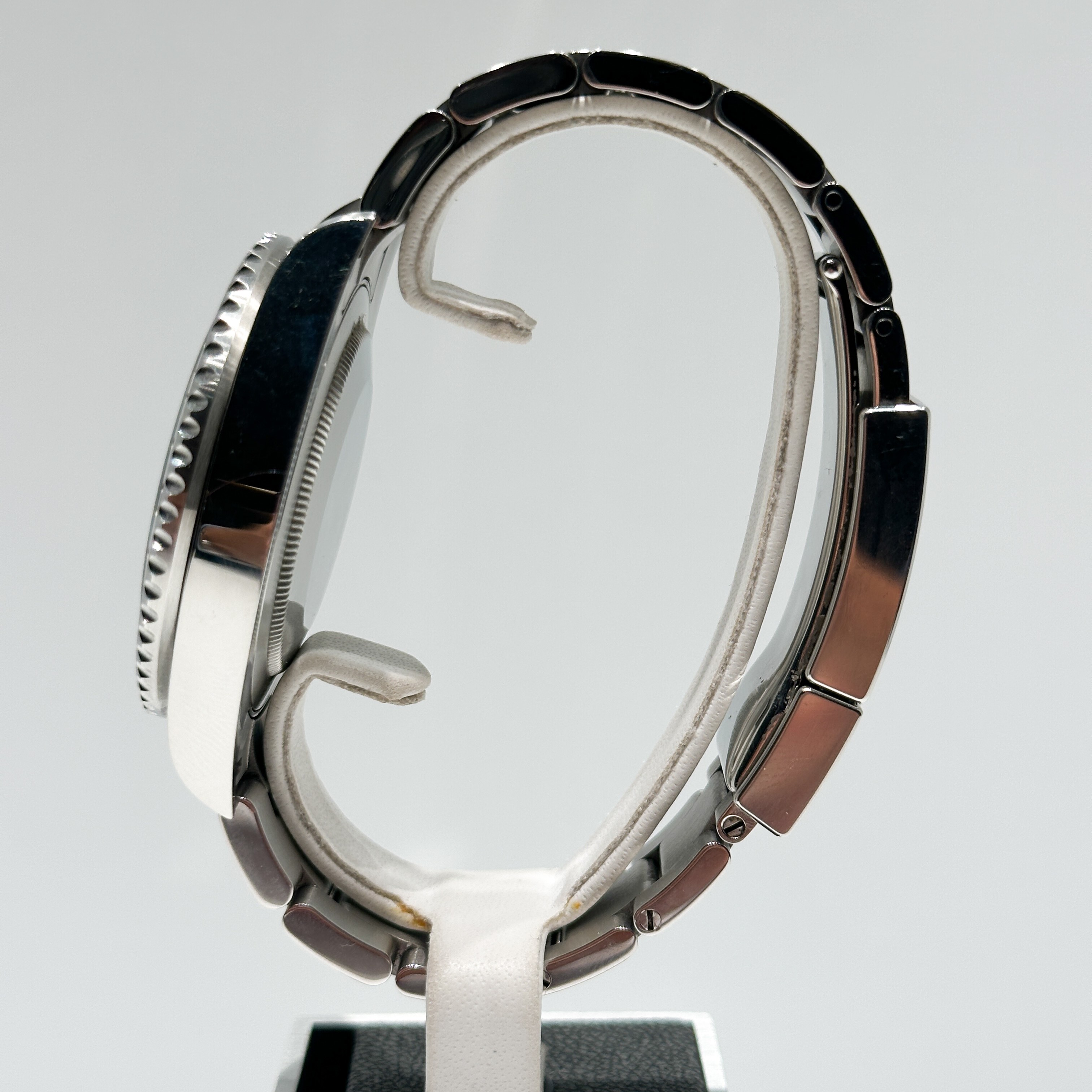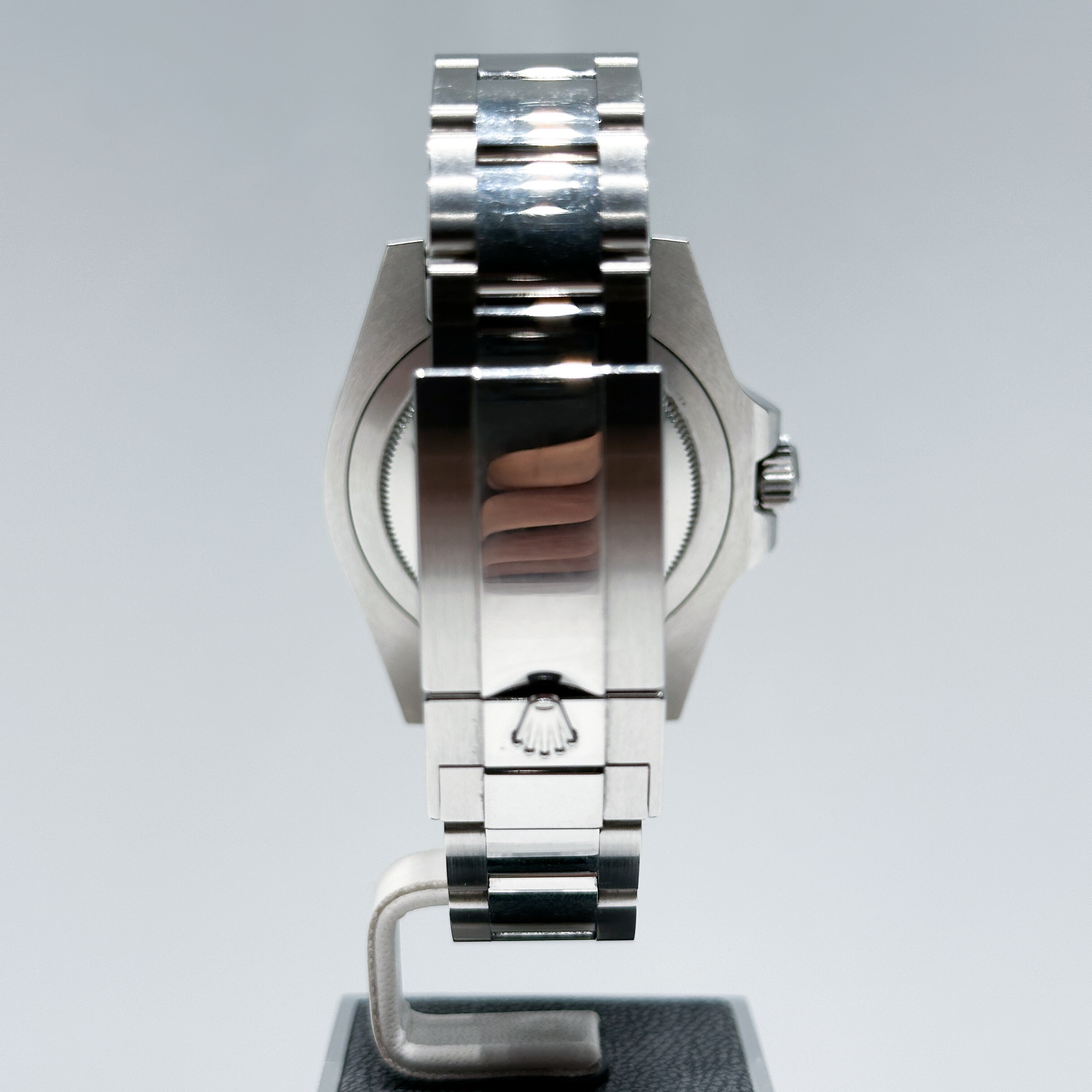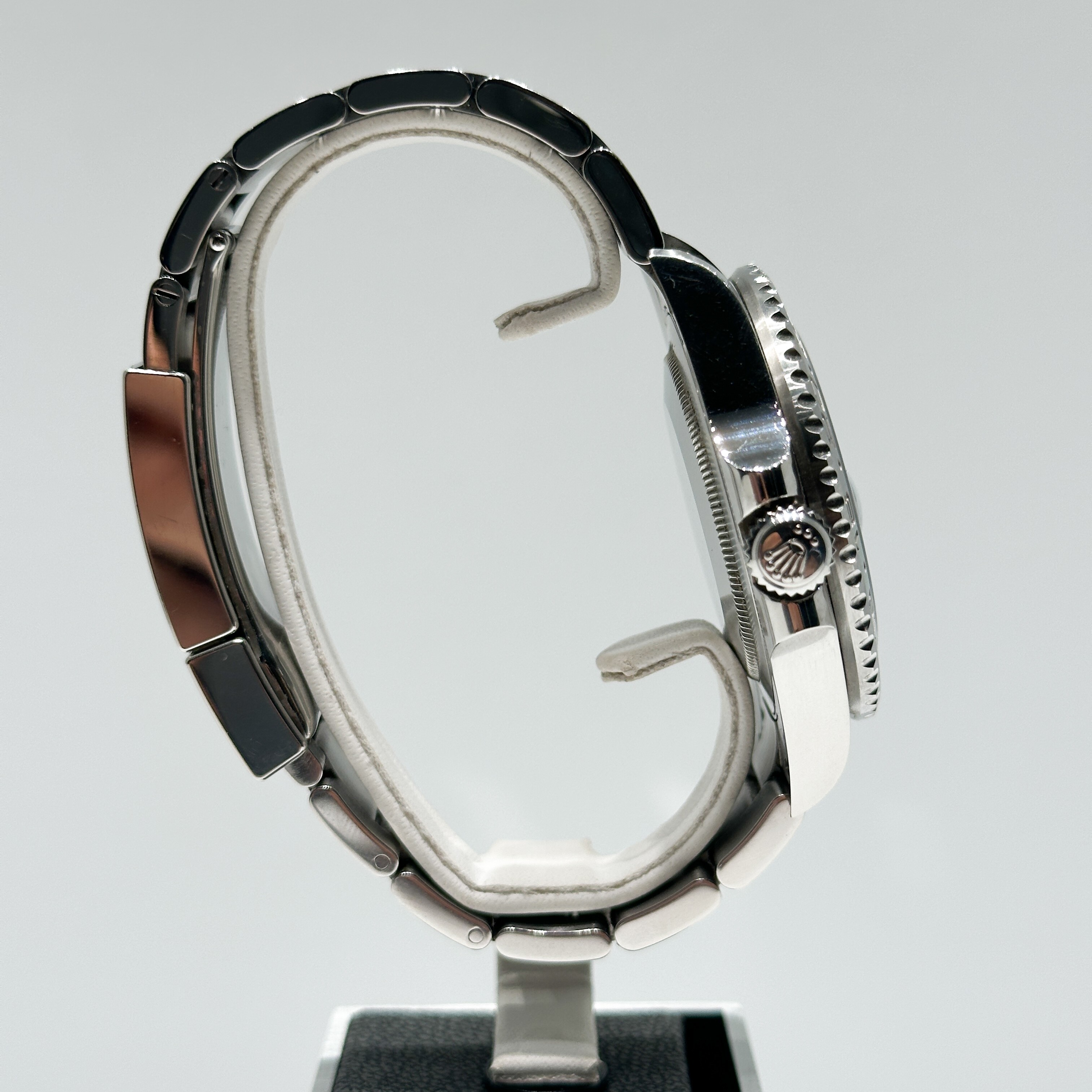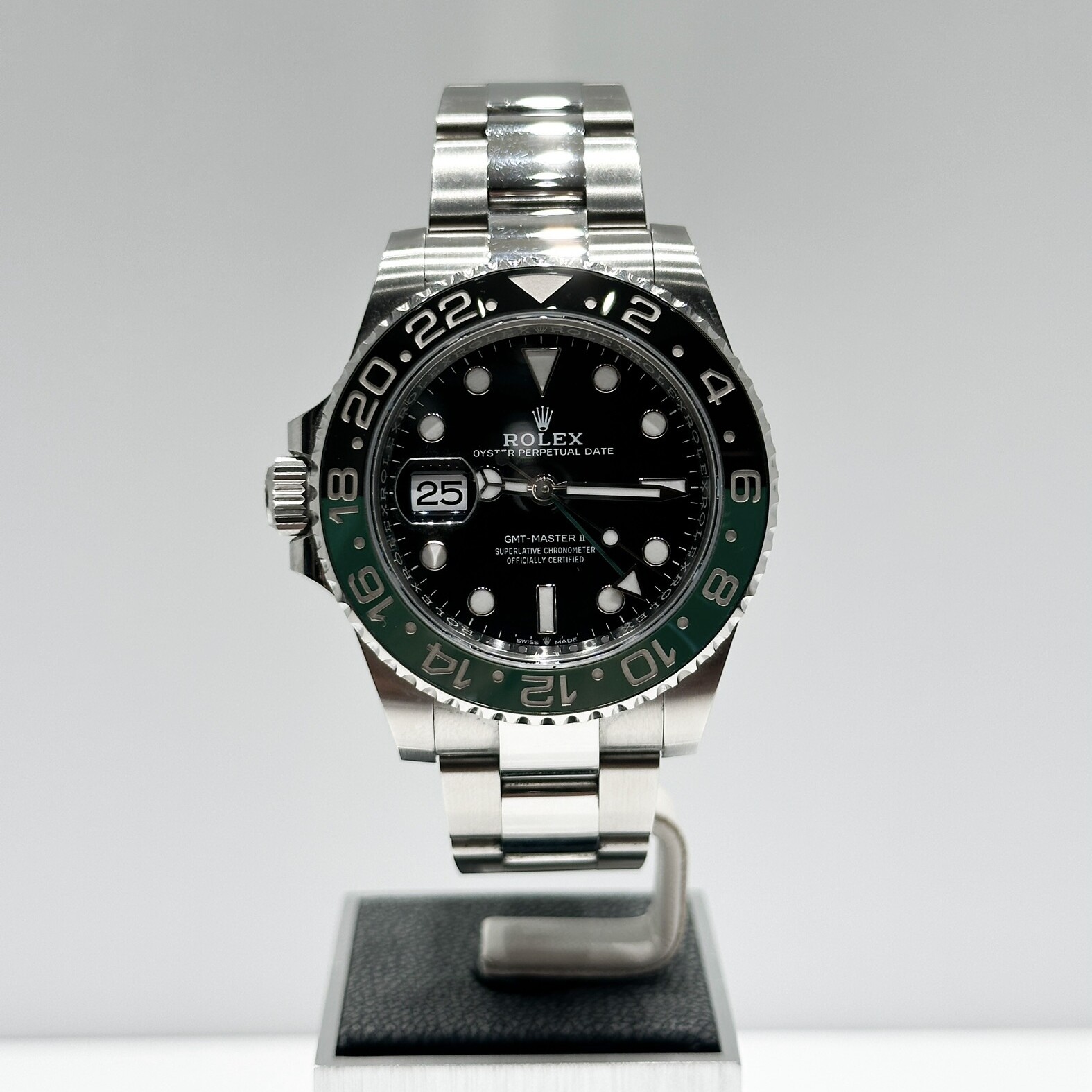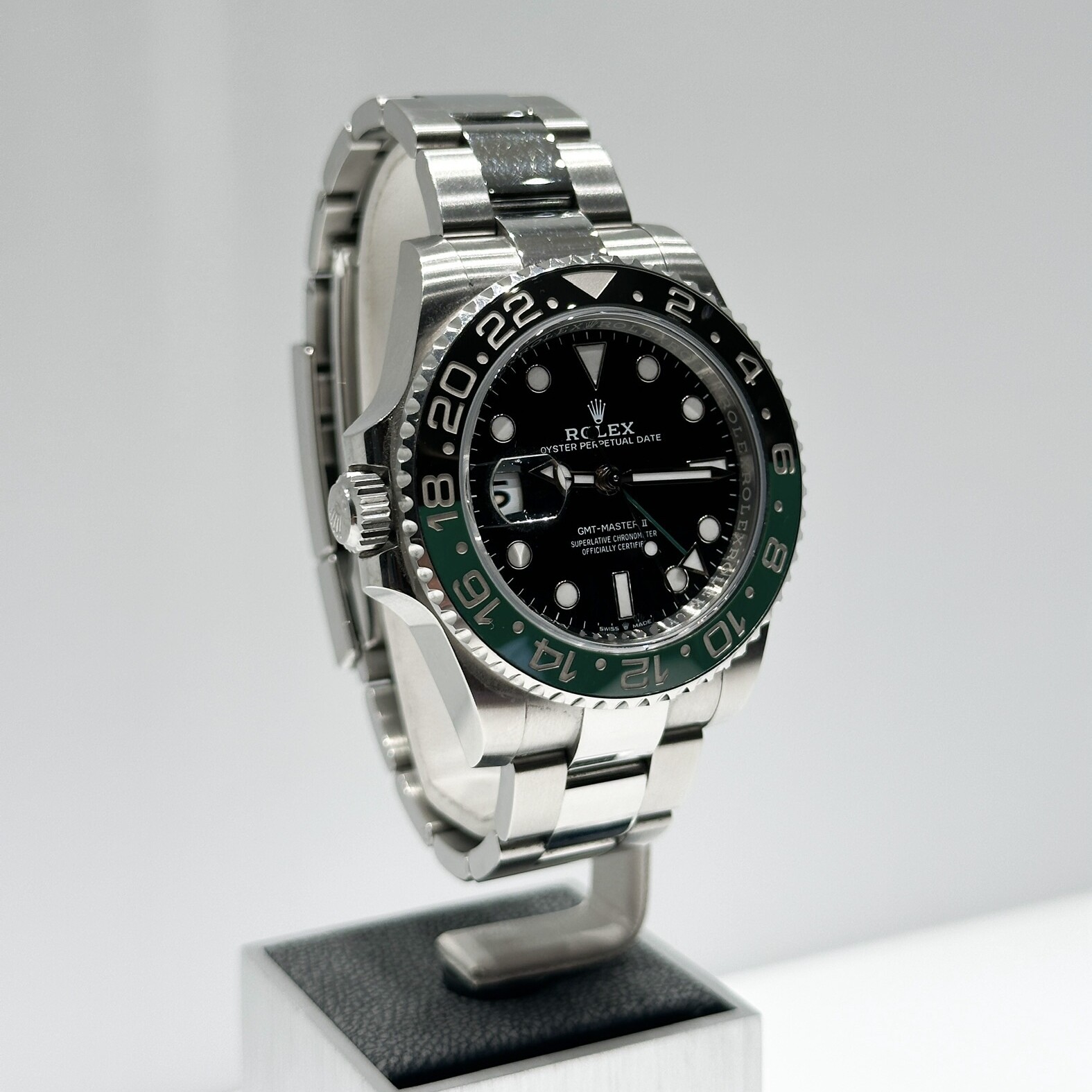 La "Sprite" se distingue par son design unique et audacieux : elle est la première GMT-Master II à arborer une configuration gaucher, avec sa couronne et son guichet de date positionnés à 9 heures. Cette particularité, combinée à sa spectaculaire lunette Cerachrom bicolore verte et noire, en fait une montre instantanément reconnaissable et extrêmement convoitée.