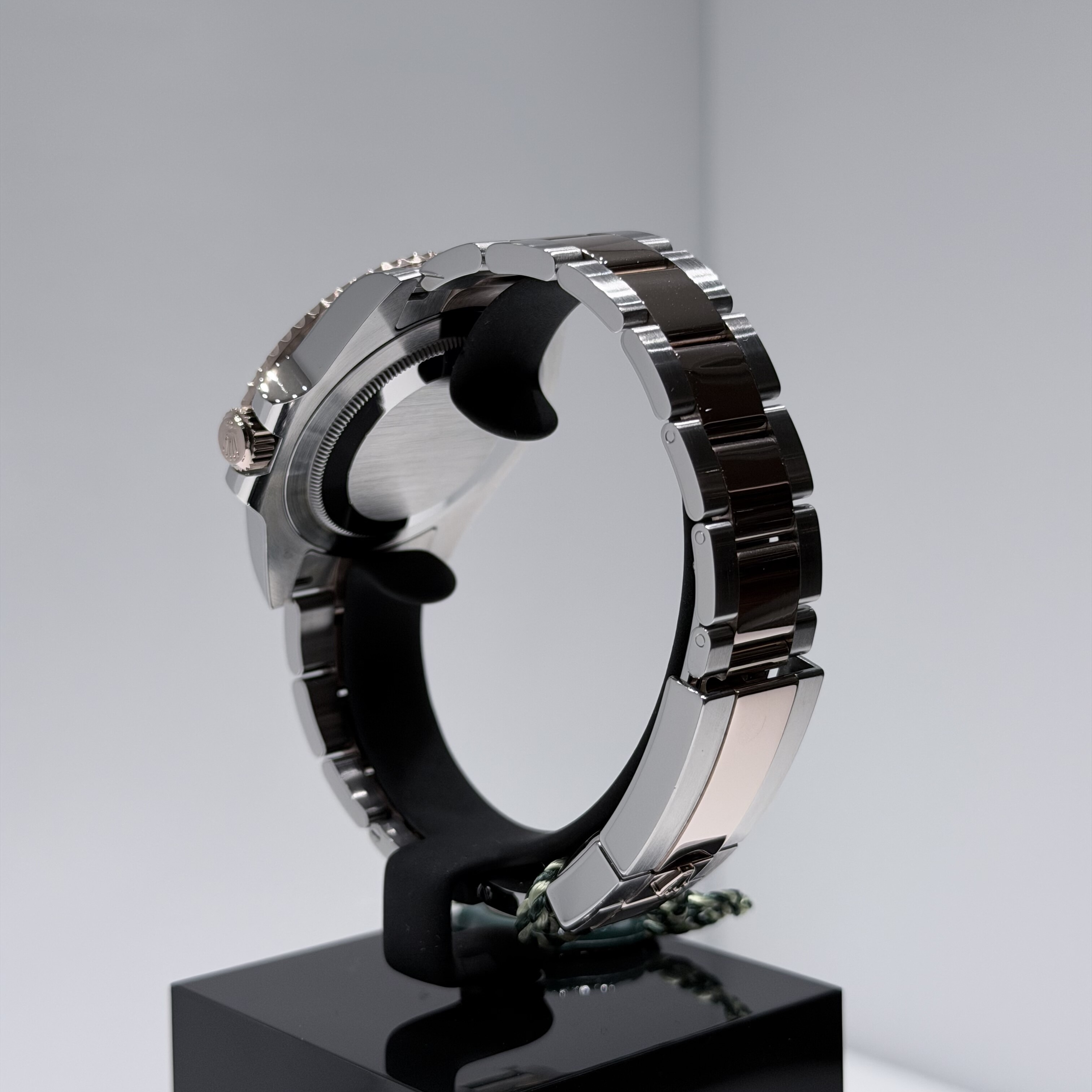 Son boîtier Oyster de 40 mm est surmonté d’une lunette bidirectionnelle en céramique Cerachrom bicolore brun et noir, permettant la lecture d’un second fuseau horaire. Le cadran noir, épuré et parfaitement lisible, est rehaussé d’index et aiguilles Chromalight.
