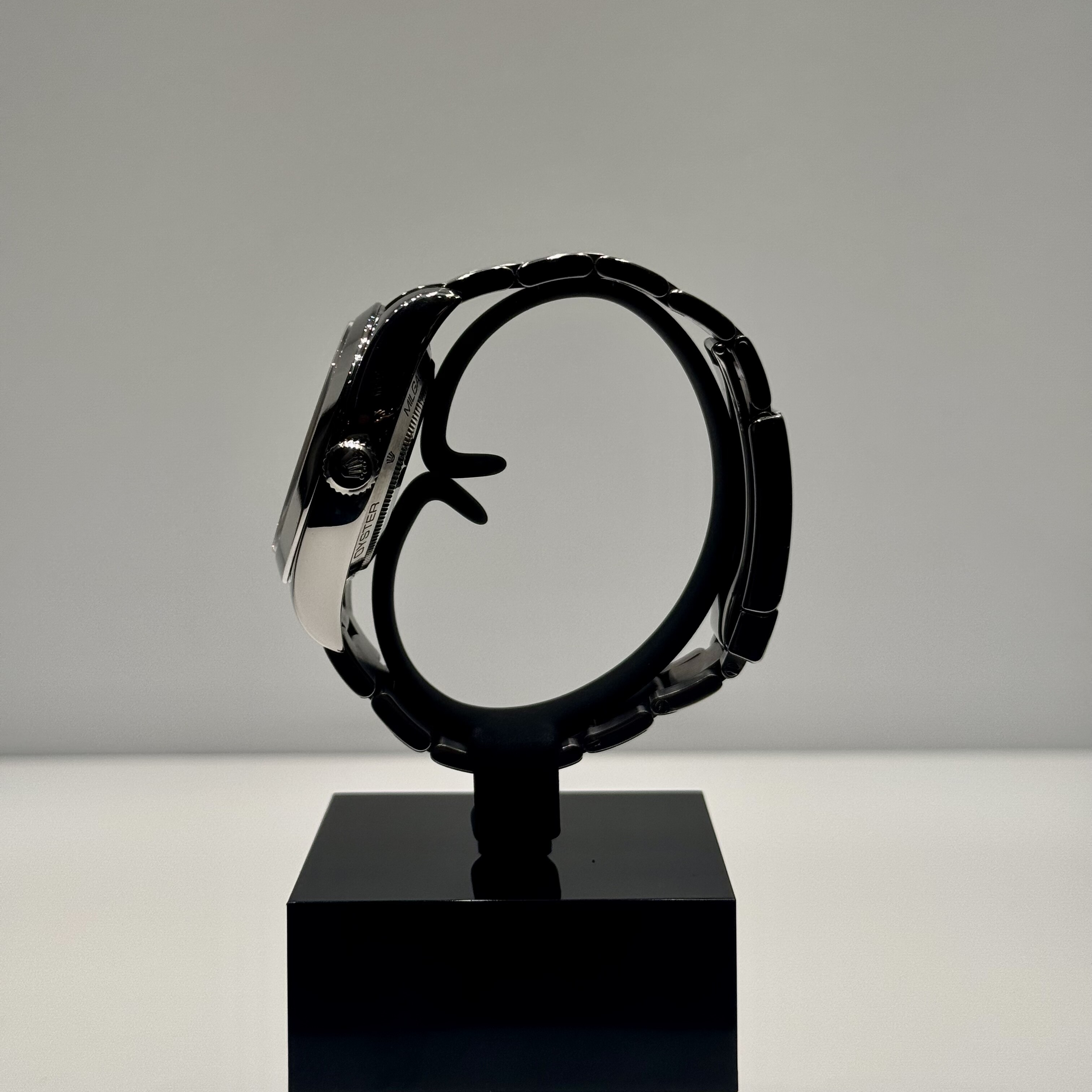 Le cadran blanc lumineux, agrémenté d’index orange et de la trotteuse en forme d’éclair, confère à cette pièce une identité forte et immédiatement reconnaissable. Son boîtier en acier Oystersteel, sa lunette lisse et le calibre automatique 3131 assurent fiabilité, performance et confort au quotidien.