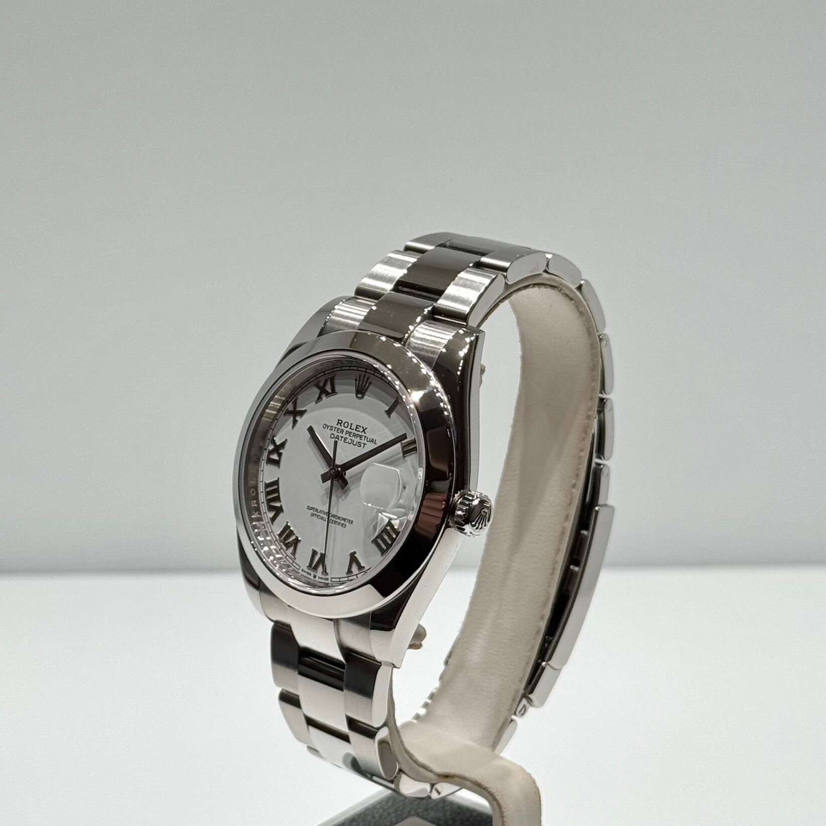 Le cadran blanc est sublimé par des chiffres romains appliqués, offrant une lecture raffinée et un caractère résolument classique. Le guichet date à 3 heures est surmonté de la loupe Cyclope, signature incontournable de la Datejust.