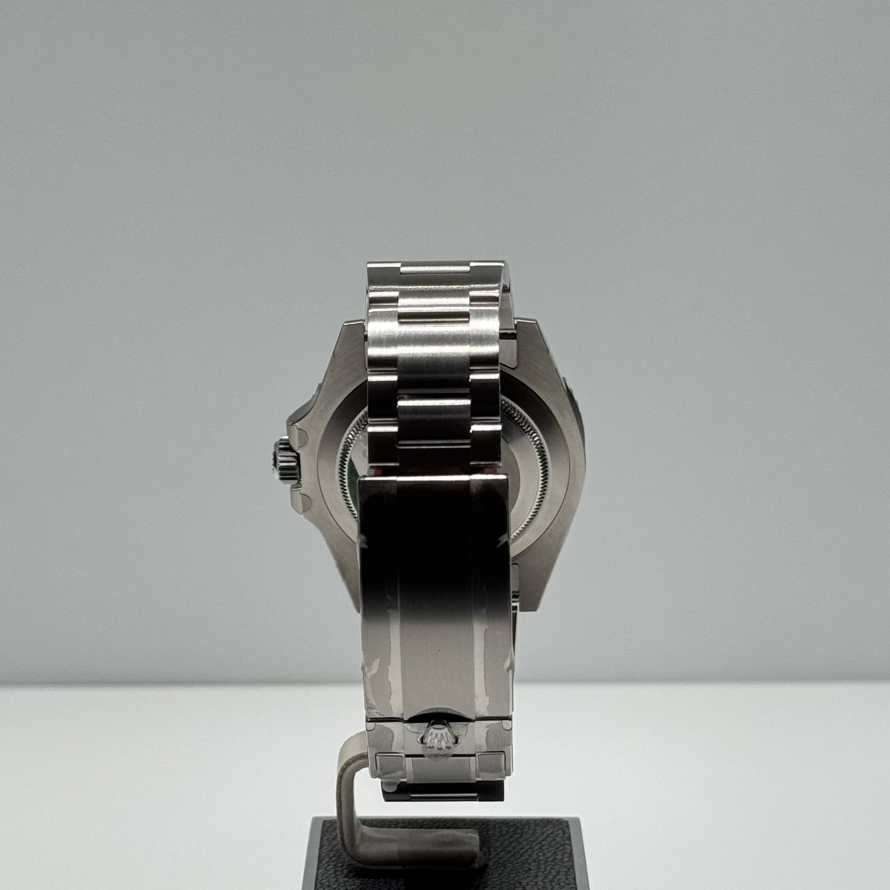 Son boîtier Oyster de 41 mm en acier Oystersteel est associé à une lunette tournante unidirectionnelle en céramique Cerachrom noire, résistante aux rayures et à la décoloration. Le cadran noir, dépourvu de guichet date, renforce la symétrie et la sobriété de l’ensemble, tout en offrant une excellente lisibilité grâce aux index et aiguilles Chromalight.
